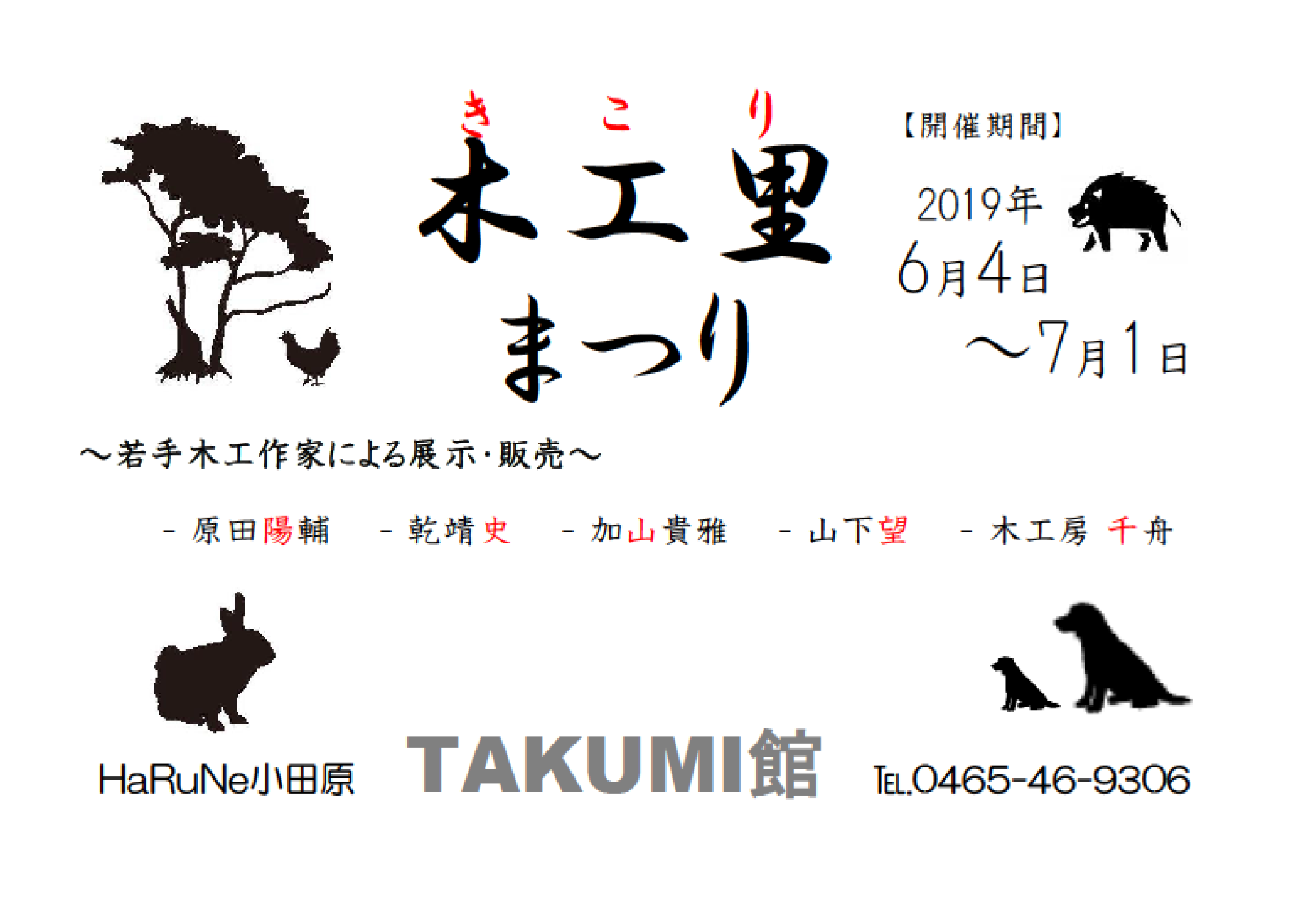 ◆イベントスケジュール◆Gallery Takumi-kan 2019年5月28日 最終更新日時 : 2019年5月29日 takumi-kan TAKUMI館内"Gallery Takumi-kan"でのイベント情報 2019年5月14日(火曜日)~6月3日(月曜日) →シンプルな木のお皿展 [主催]薗部産業 2019年6月4日(火曜日)~7月1日(月曜日) →第8回 木工里まつり [主催]原田陽輔、乾靖史、加山貴雅、山下望、木工房 千舟 共有:Facebook で共有するにはクリックしてください (新しいウィンドウで開きます)クリックして Twitter で共有 (新しいウィンドウで開きます)クリックして友達にメールでリンクを送信 (新しいウィンドウで開きます)クリックして印刷 (新しいウィンドウで開きます)