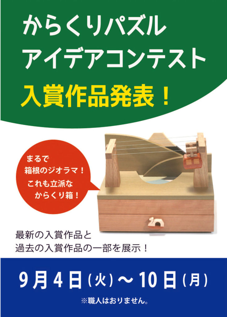 からくりパズルアイデアコンテスト入賞作品発表! 2018年9月3日 最終更新日時 : 2018年9月3日 takumi-kan 日時:平成30年9月3日(火)~10日(月) 時間:10:00~20:00 (最終日17時まで) 場所:小田原地下街・TAKUMI館内イベントスペース 「 からくりパズルアイデアコンテスト入賞作品発表!」 一般の皆様からお寄せいただいたアイデアをからくり職人が実物化しました。 今年の入賞作品をはじめ、過去の作品を展示します。 職人顔負けのアイデアあふれる作品をぜひご覧になりにいらっしゃってください。 (職人は居りません) 共有:Facebook で共有するにはクリックしてください (新しいウィンドウで開きます)クリックして Twitter で共有 (新しいウィンドウで開きます)クリックして友達にメールでリンクを送信 (新しいウィンドウで開きます)クリックして印刷 (新しいウィンドウで開きます)