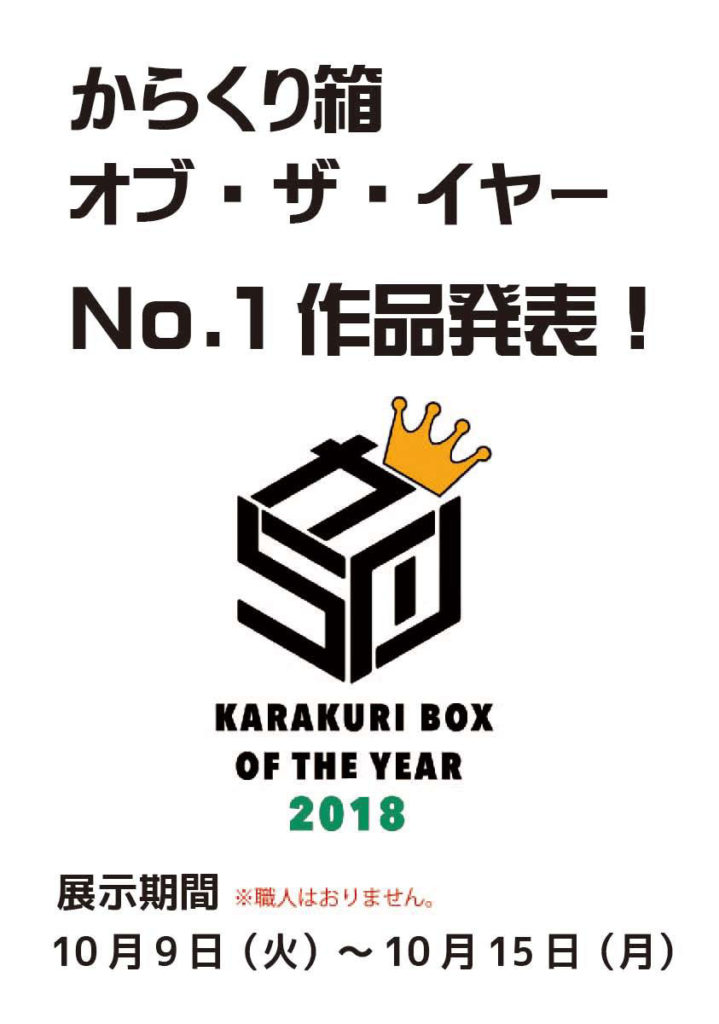 からくり創作研究会 No.1作品発表 2018年10月10日 最終更新日時 : 2018年10月10日 takumi-kan 日時:平成30年10月9日(火)~15日(月) 時間:10:00~20:00 (最終日17時まで) 場所:小田原地下街・TAKUMI館内イベントスペース 「 からくり創作研究会 No.1作品発表」 過去1年間に発表された新作のからくり箱をずらっと並べて 9/1・2・22に一般の方々に投票いただきました。今回は投票で上位になった作品を展示します。 さて、どんな作品が選ばれたのでしょうか。 結果はTAKUMI館にて!! (職人は居りません) 共有:Facebook で共有するにはクリックしてください (新しいウィンドウで開きます)クリックして Twitter で共有 (新しいウィンドウで開きます)クリックして友達にメールでリンクを送信 (新しいウィンドウで開きます)クリックして印刷 (新しいウィンドウで開きます)